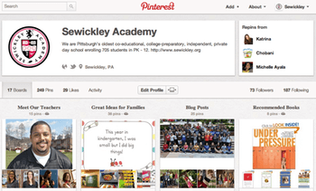 At Sewickley Academy we have the following Pinboards: Meet Our Teachers, Great Ideas for Families, Blog Posts, Recommended Books, Thoughts, Fun Stuff for Kids, History, Senior School, Middle School, Lower School, Academics, Alumni, Athletics, Arts, Pittsburgh, Summerbridge Pittsburgh, and Sewickley.