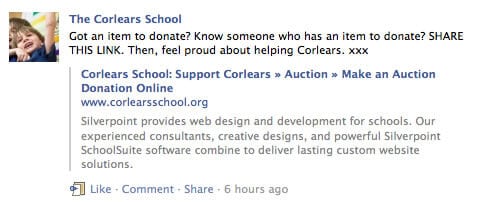 Dedicated Auction Web Page.  For this the concept was a substantive overview that I can link back to from our other channels.  I am limited by my lack of graphic design skills so the best I could do was drop a logo in and try to provide clean copy.  I  have to say though that it took more than an hour to write and edit the page and I predict that the traffic to it will not be anything like the traffic to the Facebook page. It's here.  Any insights about the ROI on developing short run web pages for school websites?